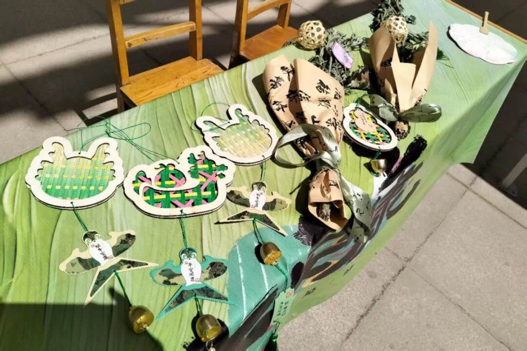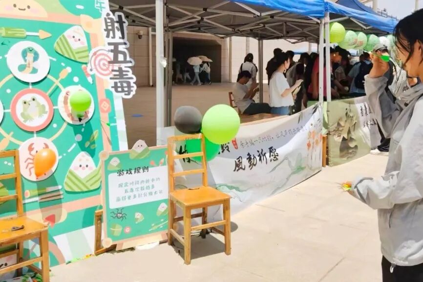 活动设置了绘制漆扇、竹编风铃,香囊缝制、五彩绳编织、艾草花束DIY等不同区域。在这里,同学们既能在漆扇上挥洒创意,感受漆扇的独特魅力;又能用竹条编织风铃,聆听那清脆悦耳的声音;还能穿针引线缝制香囊,祈愿平安健康......此外,“射五毒”游戏区更是备受欢迎,大家在趣味互动中了解传统民俗,共同沉浸于传统文化的魅力之中。