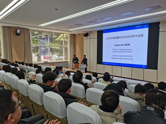 12月18日下午,新西兰林肯大学农商学院马旺林教授应农林经济管理学院邀请,在段家滩校区崇文楼114报告厅作了题为《人文社科高质量 SSCI 论文的写作与发表》的专题讲座。本次讲座由农林经济管理学院院长张永凯主持,学院教师代表及2024级、2025级全体硕士研究生参加。