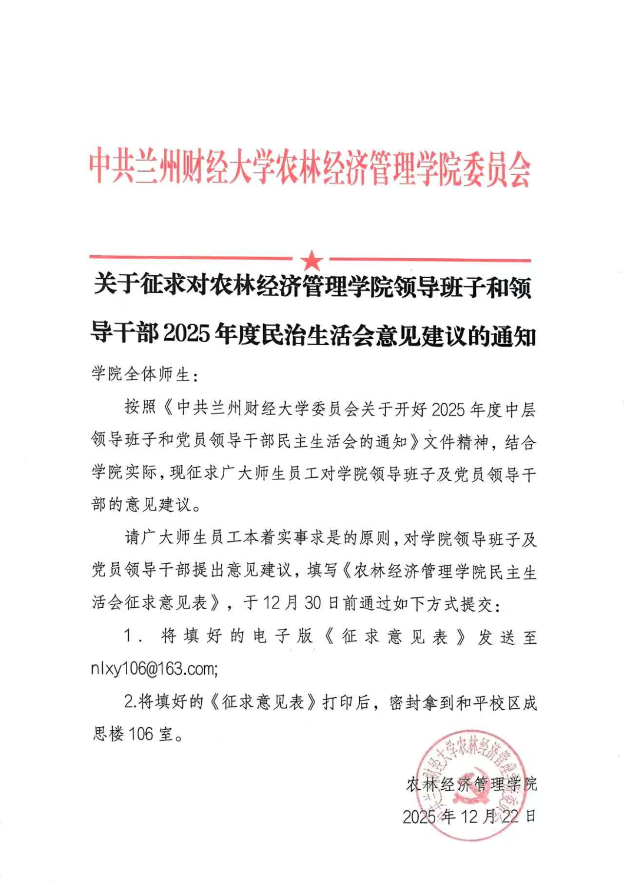 关于征求对农林经济管理学院领导班子和领导干部2025年度民治生活会意见建议的通知